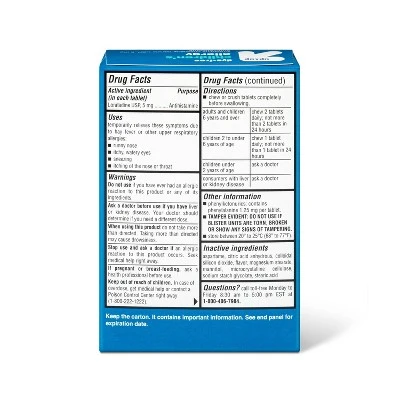 Compare to the active ingredient in Children’s Claritin Chewables. up & up™ Loratadine antihistamine helps to relieve sneezing, runny nose, and itchy, watery eyes/throat/nose. This medicine offers 24-hour relief of symptoms caused by indoor and outdoor allergies. For children 2 years of age and up. Active ingredient: Loratadine USP 5mg. Inactive ingredients: aspartame, citric acid anhydrous, colloidal silicon dioxide, flavor, magnesium stearate, mannitol, microcrystalline cellulose, sodium starch glycolate, stearic acid