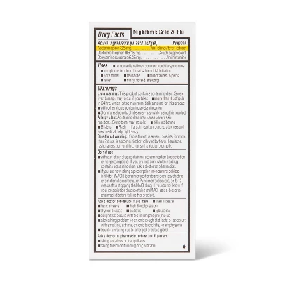 - NIGHTTIME COLD AND FLU MEDICINE provides multi-symptom relief of headache, fever, sore throat, sneezing, runny nose, cough, and minor aches and pains.