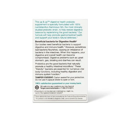 These Probiotic Capsules from up & up™ are designed to help you take care of your digestive health. Trillions of friendly bacteria make their home inside your digestive system, helping maintain a delicate balance inside your intestinal tract. When that balance gets disturbed, it can result in gas, bloating and other digestive issues that can cramp your style. Taking a once-daily probiotic supplement may help restore this balance and improve digestion, helping you feel healthier all around.