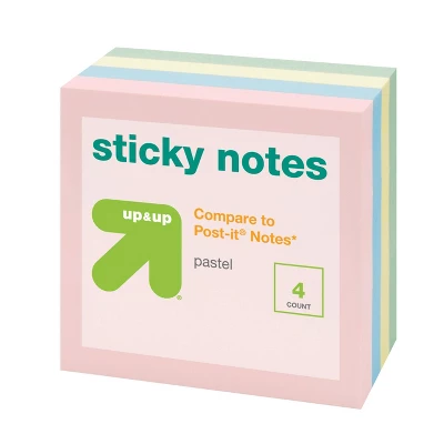 Complete your everyday tasks with the 4pk 3″x3″ Sticky Notes from up&up. These sticky notes feature 400 sheets which will keep you stocked up for a long time. They come in four pretty colors so you can always have a note close by for quick memos and reminders with the sticky notes cube.