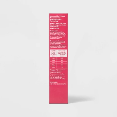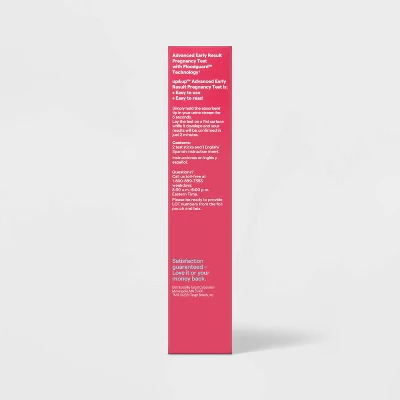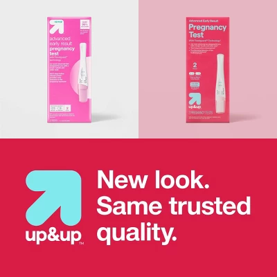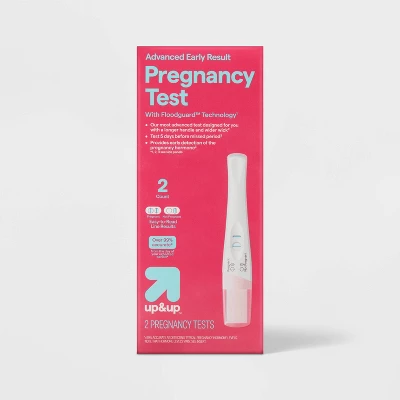 The up&up™ Advanced Early Result Pregnancy Test with Floodguard™ Technology3 is our most advanced test, designed for you with a longer handle and wider wick4. This test can be used up to 5 days before your missed period, which is 4 days before your expected period. The advanced early result pregnancy test is easy-to-use and easy-to-read, so you won’t have to question if you’re pregnant or not. If you want to double check, this pack includes two tests, so you can test again next month or confirm a positive or negative result. Simply hold the absorbent tip in your urine stream for 5 seconds and in just two minutes, you’ll have a clear result. Please read product insert before taking the test.