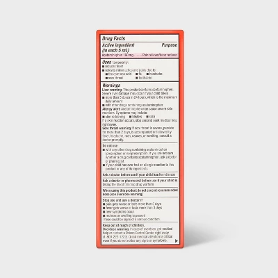Compare to Childrens Tylenol active ingredient. Rely on Children’s Pain Reliever and Fever Reducer Oral Suspension Liquid, Acetaminophen 160 mg per 5 mL, bubble gum flavor for fast, effective relief of children’s pain and fever. This product is free of: alcohol, aspirin, ibuprofen & gluten. Child-resistant safety cap. Dosage cup included. If you’re not satisfied with any Target Owned Brand item, return it within one year with a receipt for an exchange or a refund.