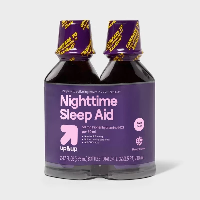 Get relief for occasional sleeplessness with this 2-Pack Diphenhydramine Sleep Aid Liquid from up&up™. This twin pack includes two bottles with 12 ounces of diphenhydramine that reduces the time needed to fall asleep. Infused with berry flavor, the soothing nighttime sleep aid is non-habit forming and is not designed for treating cold or flu symptoms.