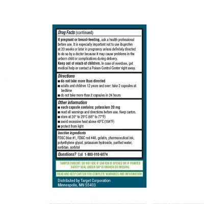 Get a good night’s sleep and wake up refreshed with the help of Ibuprofen PM Softgels from up&up™. These soft gel caps are made with ibuprofen, the NSAID pain reliever and fever reducer you’ve come to trust. Thanks to added diphenhydramine, you can feel confident that those minor aches and pains won’t keep you up at night, letting you face the next morning head on. With 40 ibuprofen softgels per bottle, you’ll rest easy knowing you’re prepared for whatever the day brings.