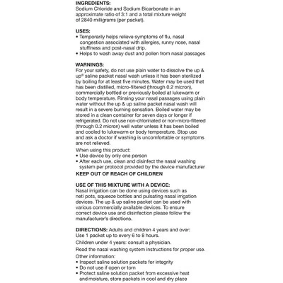 Dry conditions often lead to dry nasal passages. Maintain moisture and comfort anywhere, with Saline Packets from up&up™. Easy to use by dissolving in sanitized water and distributing with a nasal wash device, such as a neti pot. Sure to clear up sinuses suffering from congestion, post-nasal drip and a variety of allergies, these portable saline packets will go with you anywhere, so pack a few in work or travel bags so you’re never caught off-guard by nasal irritation.