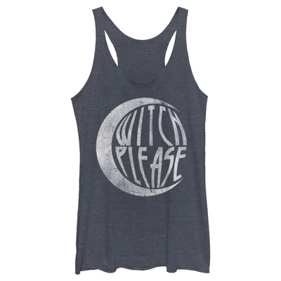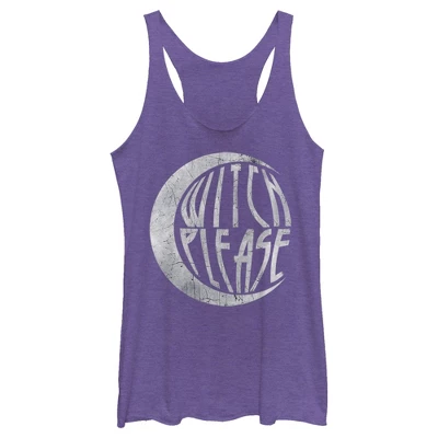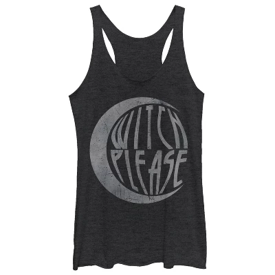 - Jump on your broom this holiday with this flowy tank top that shows off the distressed white text “Witch Please” across the front.