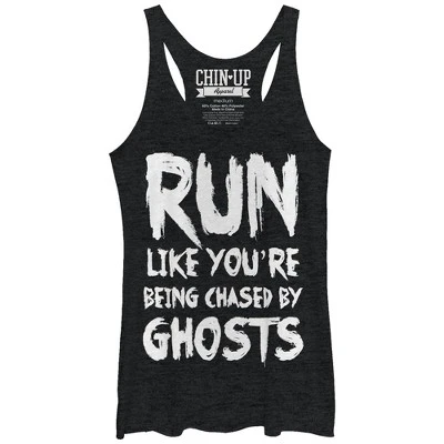 You run to de-stress, to be healthy, and to empower yourself! And ghosts…ghosts are definitely on that list too with the Chin Up Run You’re Being Chased by Ghosts Heather Black Racerback Tank Top. This hilarious soft black tank top understands that fear can also be a major incentive for your cardio workout with “Run Like You’re Being Chased by Ghosts” in a white paint-streak style.